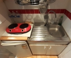 Jest w środku prysznic oraz mały blok kuchenny.
